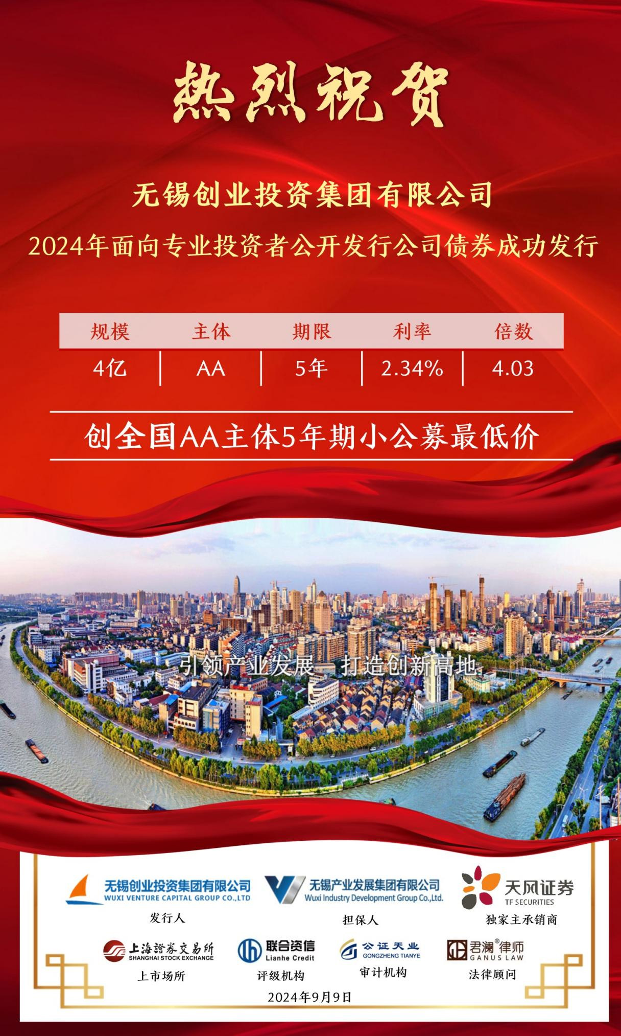 9月9日,無錫創(chuàng)業(yè)投資集團有限公司(簡稱“無錫創(chuàng)投集團”)2024年面向?qū)I(yè)投資者公開發(fā)行公司債券“24錫創(chuàng)01”成功發(fā)行,發(fā)行規(guī)模4億元,發(fā)行期限5年,認購倍數(shù)4.03倍,票面利率2.34%,創(chuàng)全國可比債券歷史發(fā)行最低利率!本期債券由天風(fēng)證券承銷,主體評級AA,債項評級AAA。 無錫創(chuàng)投集團作為無錫產(chǎn)業(yè)集團旗下的創(chuàng)業(yè)投資和股權(quán)投資平臺,近年來在集團的正確領(lǐng)導(dǎo)和大力支持下,圍繞無錫“465”現(xiàn)代化產(chǎn)業(yè)集群建設(shè),聚焦產(chǎn)業(yè)集團“1+4+X”產(chǎn)業(yè)布局,持續(xù)深化產(chǎn)融協(xié)同合作,不斷提升資金使用效率,努力為公司高質(zhì)量發(fā)展提供更低成本、更長周期、更加靈活的資金支持。未來,公司將繼續(xù)承擔(dān)國企社會責(zé)任,勇挑重擔(dān),發(fā)揮自身優(yōu)勢,持續(xù)為無錫新質(zhì)生產(chǎn)力和實體經(jīng)濟高質(zhì)量發(fā)展注入新活力、增添新動能。 |